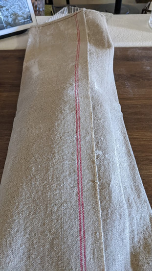 Lightly flour your surface before turning the dough onto it. Press out the larger pockets of air and square your dough out. Divide into two down the middle. Turn down the left corner then the right corner. Next, pull down from the center top pressing as you go. Now turn down the folds and press finally turning toward you and seal. Put the seam side down and place on couche or linen towels. Use folds of couche to cover the dough or cover towels with more towels to prevent a crust from forming. Allow the bread to rise until a light prodding fails to bounce back, 30-40 minutes.